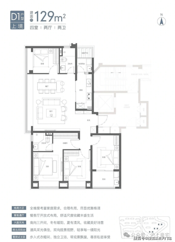 预算充足的小伙伴,可以选 建面约129㎡4房,经典的三卧朝南、边套观景户型。