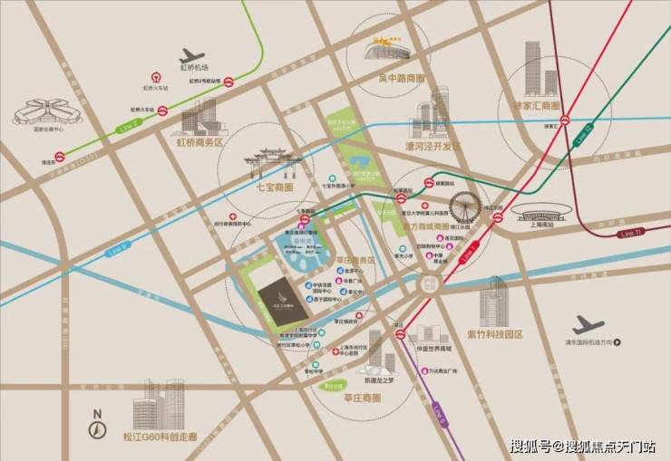轨道交通方面:项目距离12号线七莘路站步行约1200米,进站直达南京西路,未来七莘路站还明确了继续向西延伸的建设方向。自驾方面,由于地处外环高架和嘉闵高架之间,坐拥七莘路和顾戴路两条快速路也使得开车出行也十分方便,