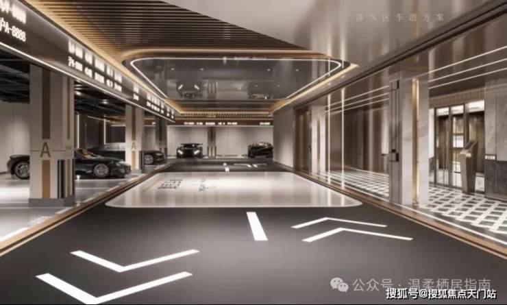 车库不仅配置了贯穿式鱼尾灯设计,在材质和细节上,车库地面还采用超耐磨地坪,精装吊顶过道,耐压防滑,静音环保。三合一门禁,也保障了业主的私密性。