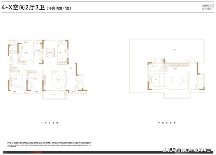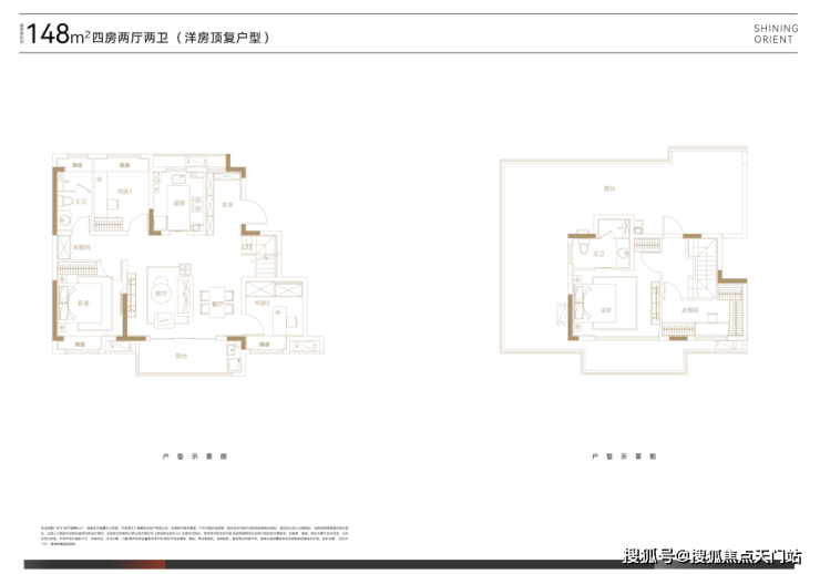 叠墅总高四层,设计了邻里空间,单元门设计也是非常的大气。上叠125㎡三房两厅三卫,顶楼闷顶层等可以拓展空间;下叠140㎡四房两厅三卫,另有超宽裕的赠送面积。