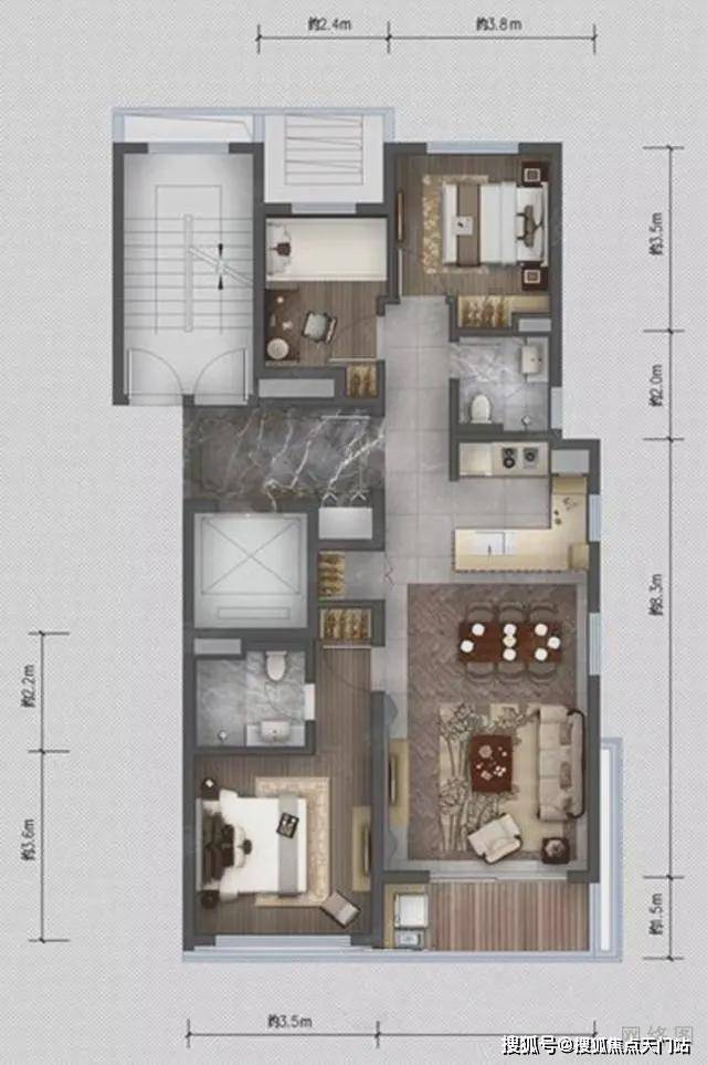 户内楼面高度不一致,错开之处有楼梯联系。但没有完全分为两层。(适合大面积住宅,小户型会显得局促)