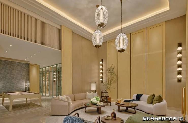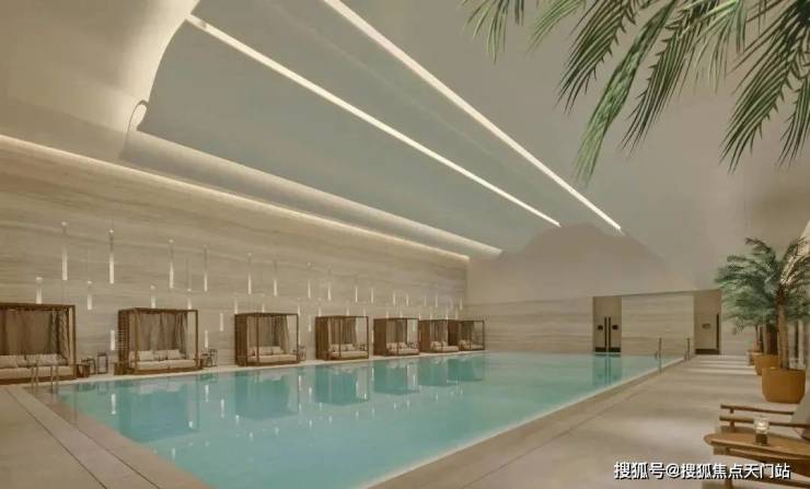 会所内的泳池上方做流畅且立体的吊顶线条,造型现代且富有层次感。 这样的设计不仅提升了空间的视觉效果,更营造出一种轻松、悠闲的度假氛围。