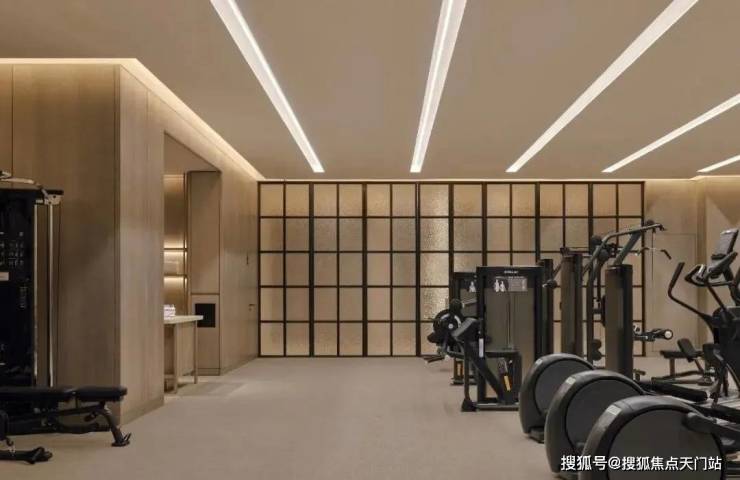 健身房的设计也同样充满了细节。黑框玻璃门的复古韵味,和现代健身空间的功能性做到了完美结合。