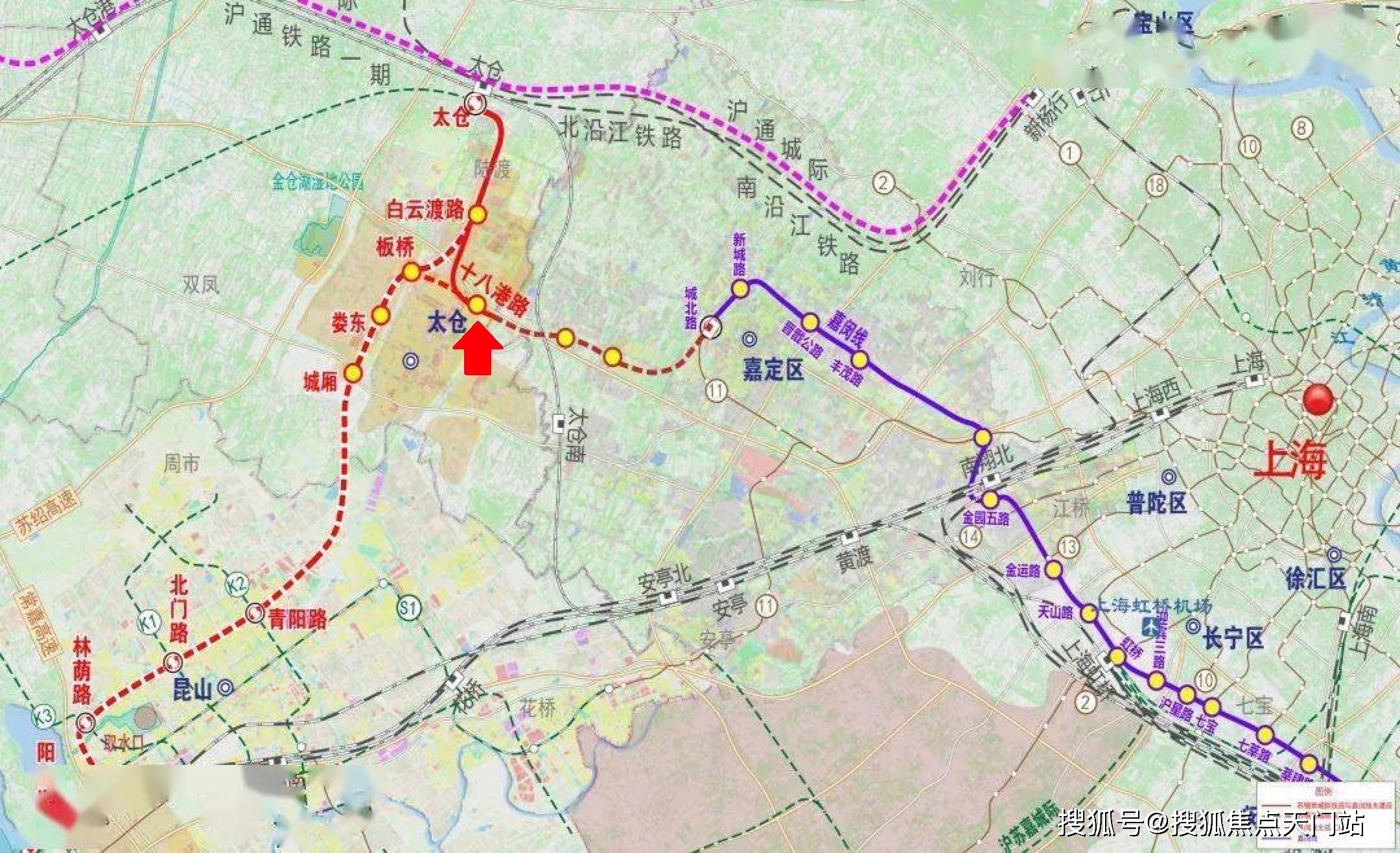 上海嘉闵线(含北延伸)是上海首条延伸至周边城市的市域铁路,设计速度160km/h,在娄江新城域内设3座站点,进入太仓的排名前列站就是十八港站。