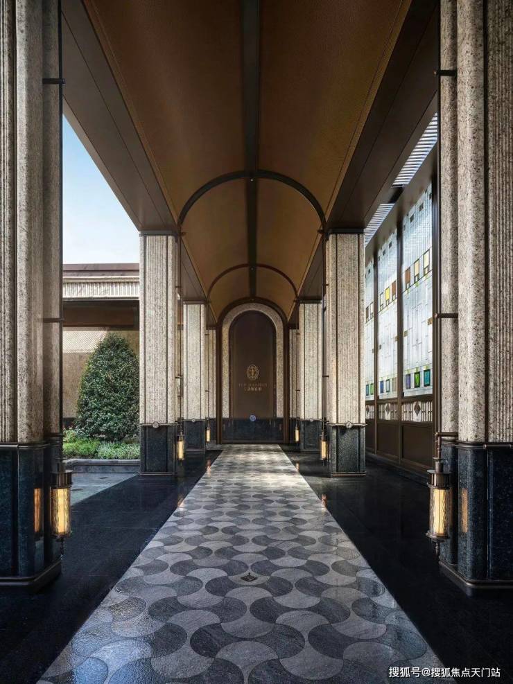 约30米的艺术连廊,借鉴PRADA荣宅多立克柱式以及和平饭店的拱形廊道,摩登海派,魅力十足: