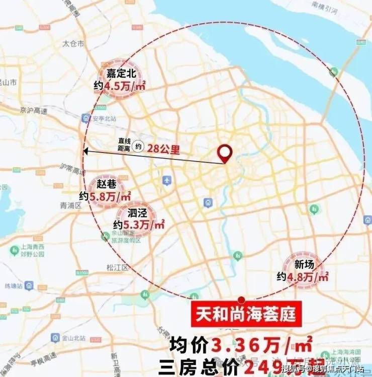 项目直线距离人民广场约28公里,我们以相同半径画圈,同一纬度的圆周板块,新房价格普遍超过5万/㎡而项目首开均价仅约3.36万/m²,“突兀”得有些不现实,无疑是同纬度下性价比之选