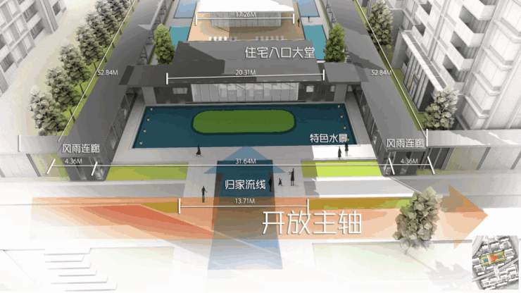 一条连续的公共通廊由海天湖公园引入社区,贯穿三大功能结构区。