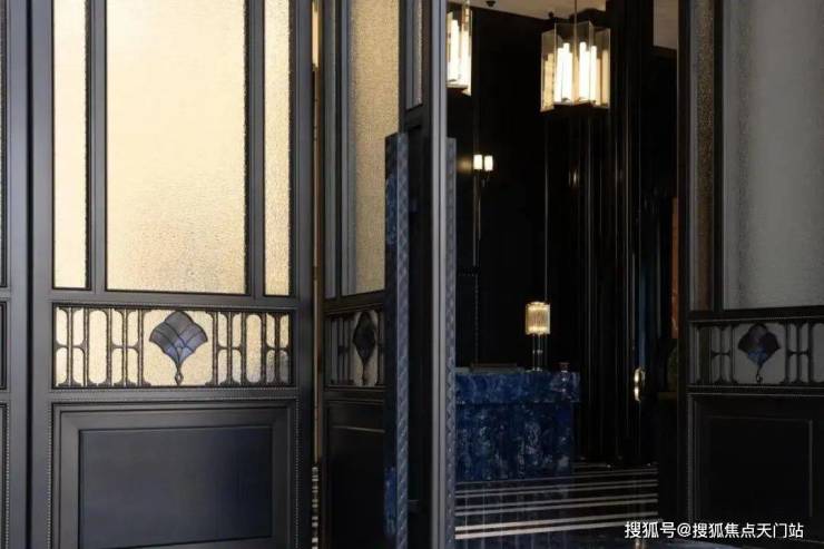 而在上层,则采用了上海海鸥丽晶酒店同款立面石材——巴西金;大门的门扇部位以高超的陶瓷镶嵌铜丝工艺,配纯手工掐丝珐琅贴片的精制拼贴。