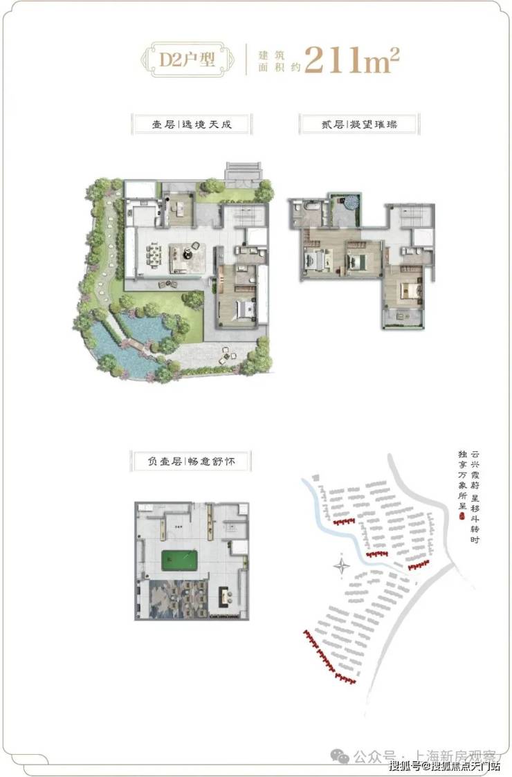 从户型设计上看: 建面约138-188㎡联排与建面约211-214㎡院墅产品,庭前绿地,大面宽,地上仅2层,真正的低密宽境别墅,产品力断层式领先。