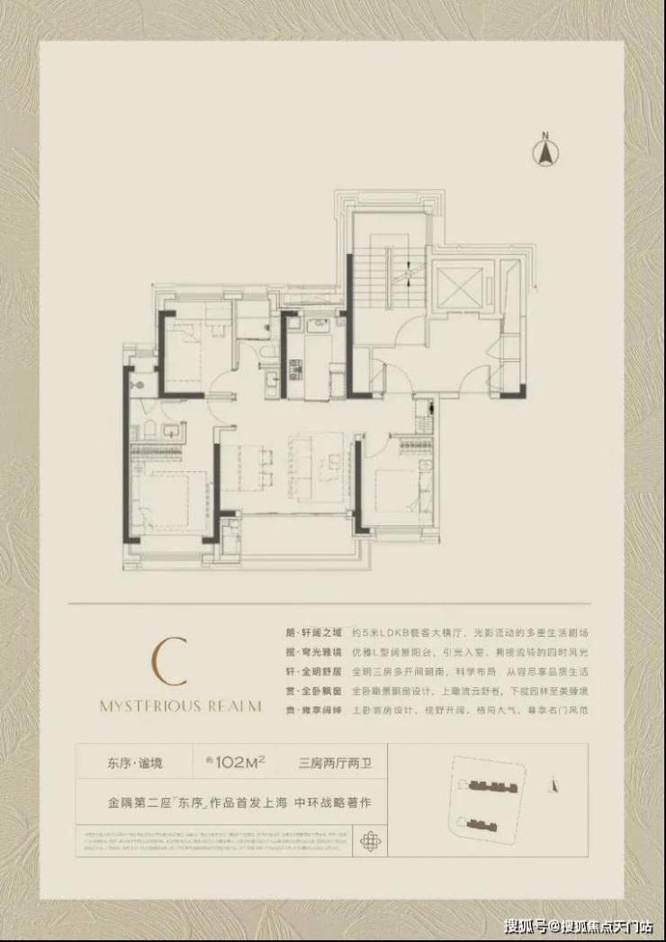 约102㎡的全明户型,三房两厅两卫格局,设计同样巧妙。