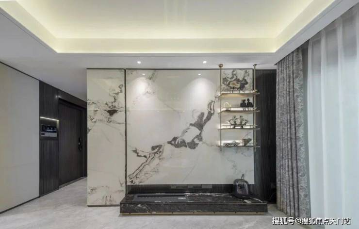 金茂定制壁布或墙纸交标结合 芬迪白岩板客厅背景墙 ,地面采用马可波罗(或同等品牌)大板砖,以定制设计感提升空间立体感。