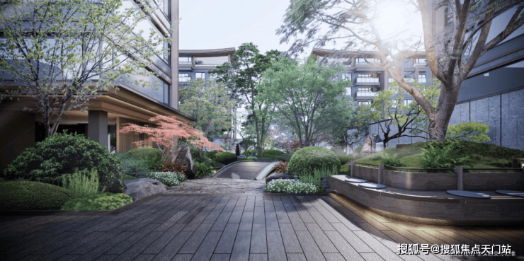 雅致石院与中庭古树相映,植物组团错落有致,营造出清逸山水园林之美,唤醒人们对林荫树下休憩闲聚的场地记忆。