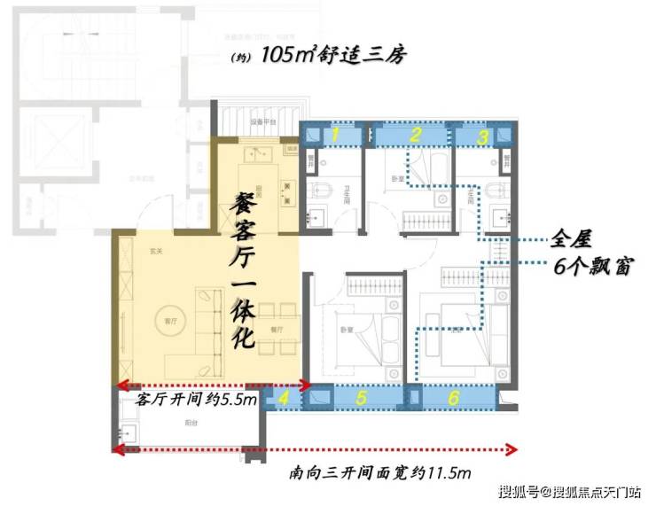优越的窗墙比,可以最大限度将优美的景观纳入眼帘;南向三开间面宽更是达到了约11.5米 ,可以说市场同户型面积段产品很难做到这样极致化 ;功能房间以舒适度为导向服务生活,尺度均做到了当下主流产品水平之上;并且全屋附赠6处飘窗,高附加值令人心动。