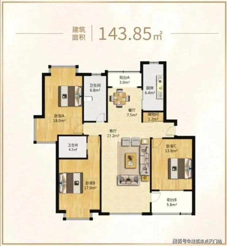 5号1202室建面约143.85m²3房,总价11223896元