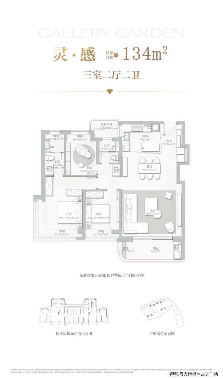 建面约134㎡3房2厅2卫, 主力总价约1500-1700万,户型设计在上一个户型的基础上将各功能间尺度升级的同时,也做了一些更人性化的迭新。