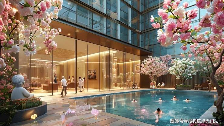 穿过会发光的玻璃大门,第一个迎接你的是“酒店式会所”——恒温泳池像蓝宝石嵌在落地窗边,退休阿姨们在水里慢悠悠划动手臂,窗外是开着粉白色海棠的庭院。傍晚时分,年轻夫妻推着婴儿车在塑胶跑道上散步,孩子们在“家庭成长树”雕塑旁追逐打闹,树洞造型的休息区里,两位老爷爷正在下象棋。