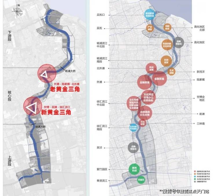 2035年“一江一河”战略明确,黄浦江沿岸将形成两大黄金三角: