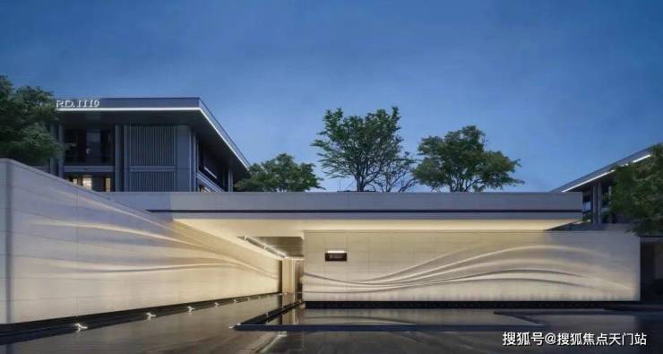 采用米黄色温润石材,巧妙模拟风的流畅形态,营造出既庄重又舒适的归家氛围。这片宽广的流线型石墙在柔和灯光的映衬下,更显璀璨夺目,而风雨连廊的灯带设计,更添一份尊贵仪式感。