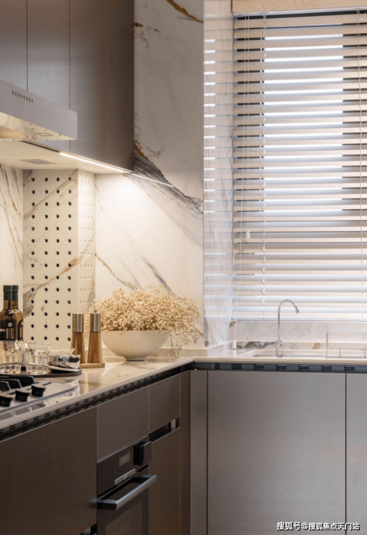 厨房内,标配最顶级的嘉格纳油烟机与燃气灶,搭配博世BOSCH冰箱,以及骊住LIXIL水槽。