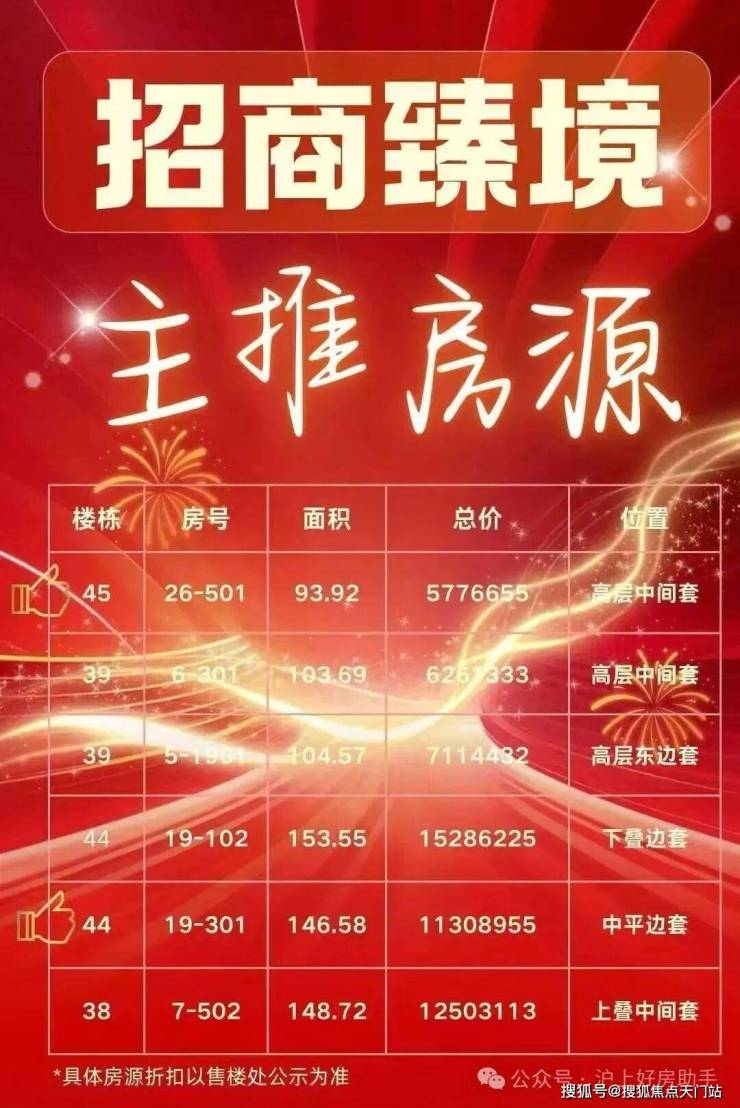 最新消息:【招商臻境】三期加推建面约95-150㎡高层&叠墅,首开124套房源,其中95㎡高层3房102套全开,总价约530万左右,148-150㎡叠墅22套,上叠约1300万起,中平约1120万起,下叠约1350万起!正在认购中,前期少量建面约89-148㎡房源在售,可直接认购!另二期全新101㎡高层景观3房加推!样板间线上预约中!