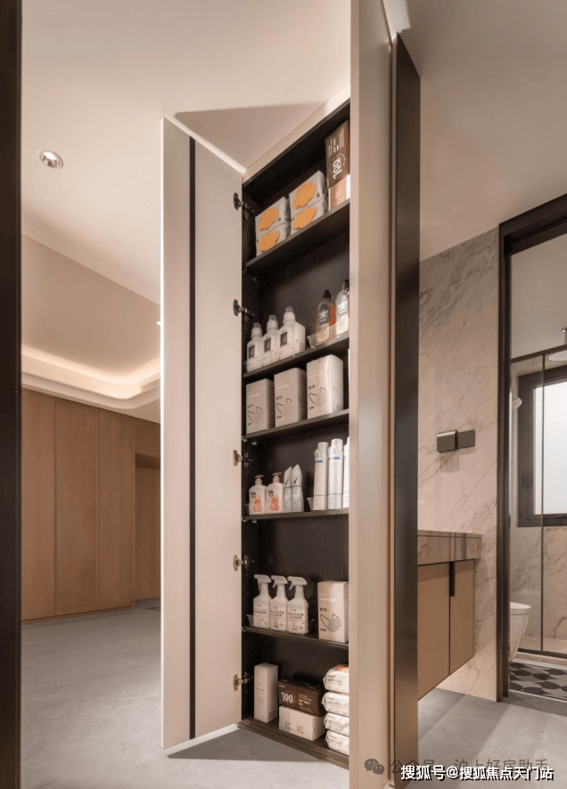双薄柜设计则大大增加容纳空间,举例来讲,可容纳约200包纸巾,足以满足全家1年使用。而洞洞板设计,则可收纳清洁工具、长柄伞等大件日常用品,如此贴心布局,保证室内物品足够井然有序,也更为利于家庭日常打扫。