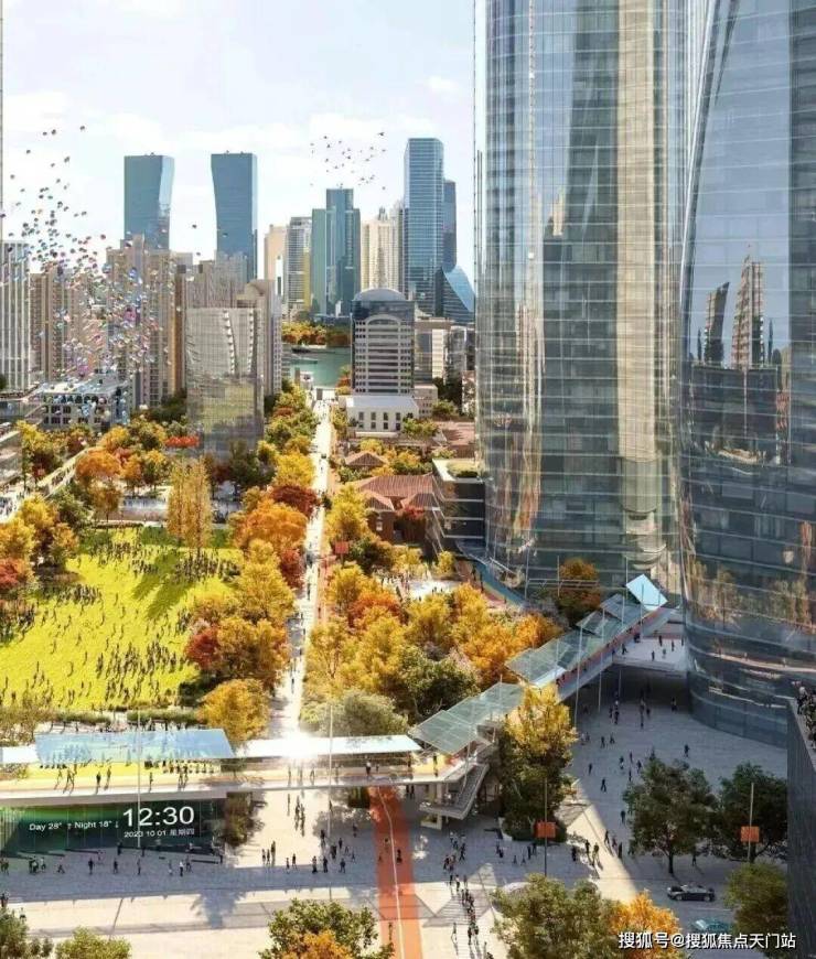 通过高线公园式廊道衔接社区与城市,实现“树梢高度观景”,让业主在漫步中同步享受绿意与江景。