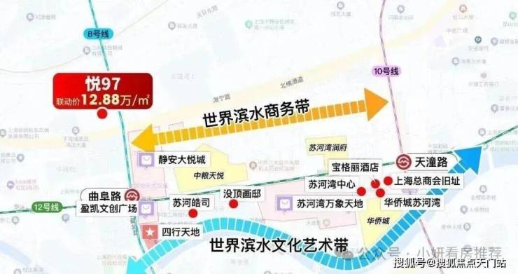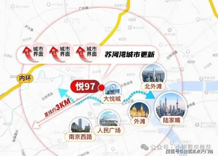 悦97坐拥苏河湾区域,约2.2km直达人民广场!约3km范围内覆盖全市顶层城市配套:外滩、南京西路、静安寺、新天地等!完全满足具有全球化视野的菁英人群对国际化生活方式的多样化需求!