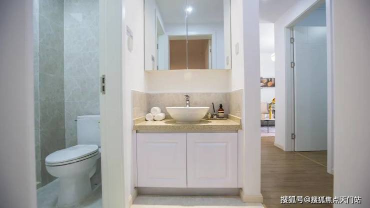 也正是因为一个卫生间,才能做出这样的尺度感。镜柜打开就是收纳空间,整体干湿分离,一边可以洗脸刷牙,一边可以上厕所,尽可能满足多人口使用的需求。即使早上也来得及,三口之家的使用绰绰有余。