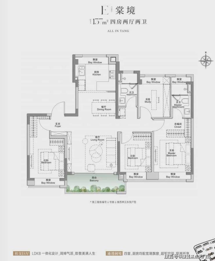 足足2个阳台+4个飘窗,2个卧室,1个卫生间,1个厨房全部“扩容”,尤其是 主卧270°全景飘窗的设计非常少见 ,未来窗外的胜境将一览无余。