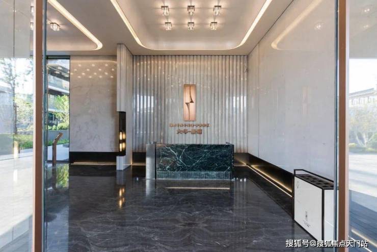 3、高端的爱马仕灰奢石打造的景墙,转角弧面犹如犹如翡翠赌石,优雅贵气。