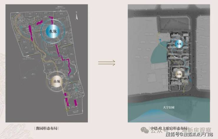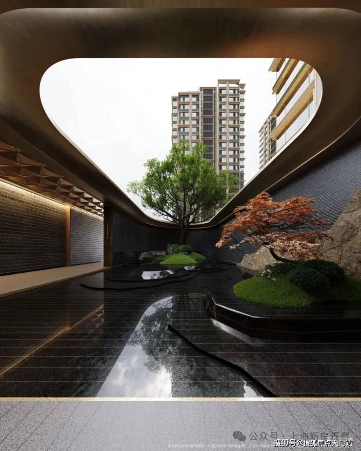 社区内部, 设计团队以豫园为灵感蓝本,运用现代手法重新诠释豫园的“山脉”与“水脉”,打造出一座立体起伏的山水园林。