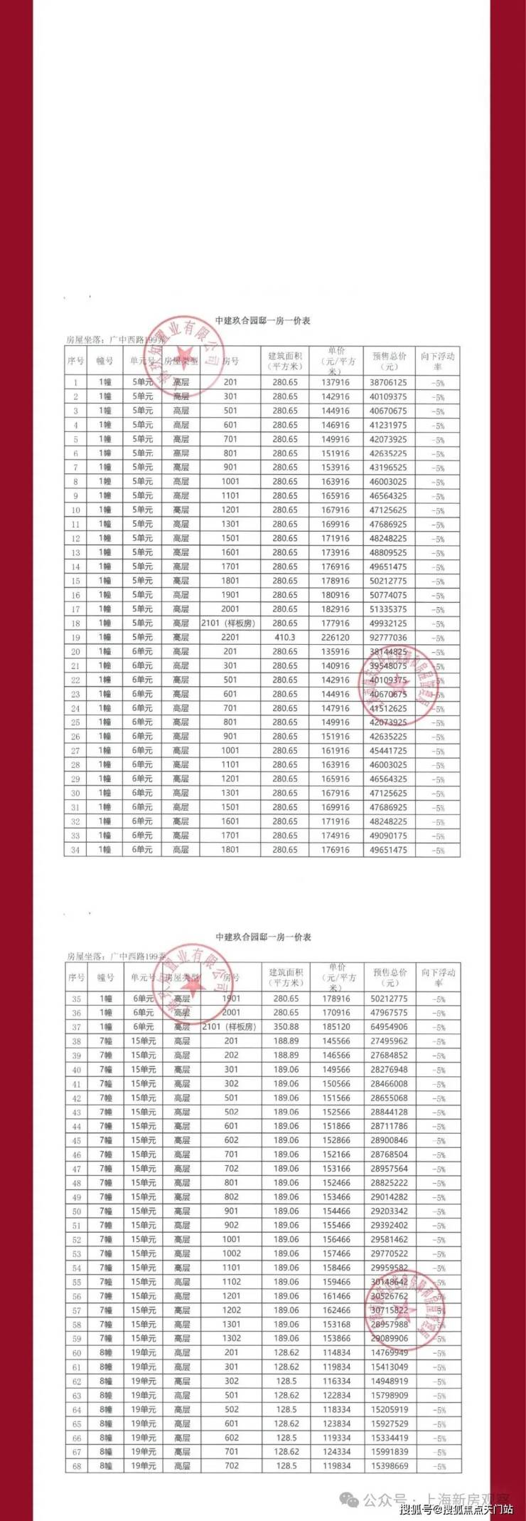 一房一价表如下