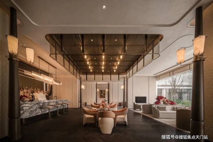 弧形温润,是贯彻招商序始终的审美语言。弧形石材工艺因其造价高、耗料多而闻名,而招商序从门庭、游廊、转换厅、风雨连廊到下沉式庭院,一以贯之的弧形石材,形成了统一的设计语言,招商序将这种传统豪宅的设计手法融入其间,营造视觉上的柔和高级感。