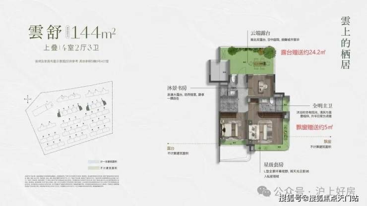 建面约144㎡的上叠产品,通过巧妙的 挑 空 、 总计 约 15㎡露台 及 灵动空间 设计,让户型的 实际可使用面积高达约180 ㎡,实得率约125%。