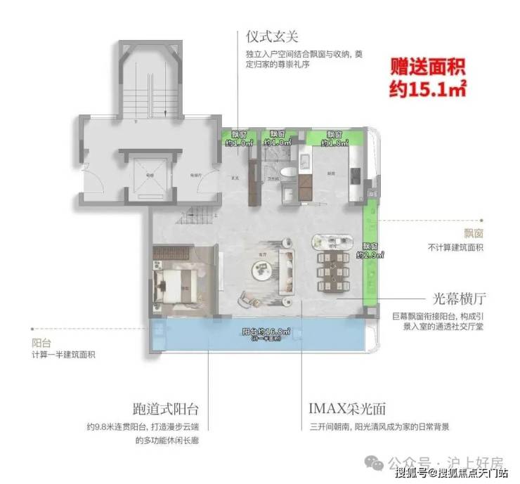 在细节打磨上,此户型亦不遗余力。 全屋飘窗全赠送约9.8㎡,配合约7.2㎡的大阳台(计一半建筑面积) 不仅增加了实际使用面积,更在视觉上提升了空间的通透感。