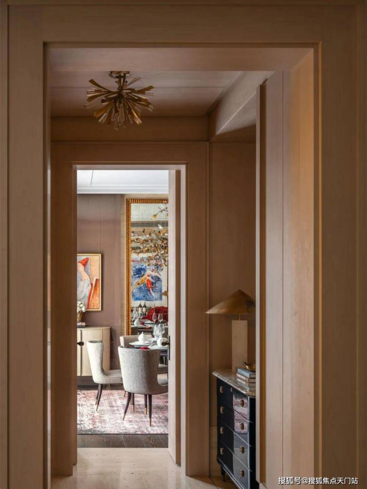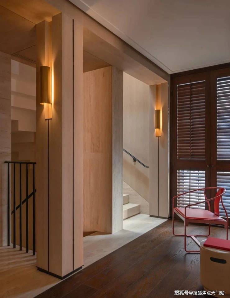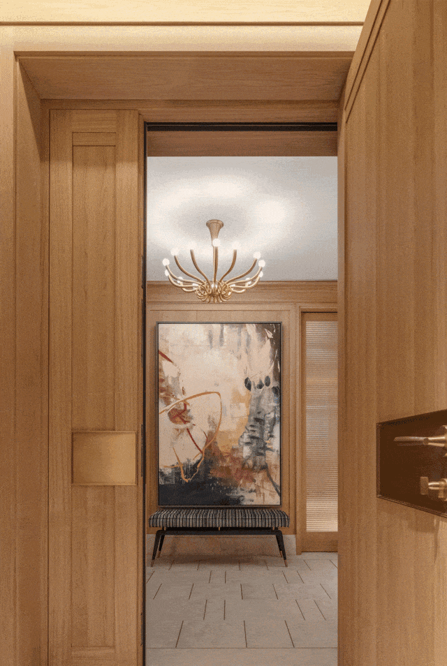 入户空间由一个简约的门厅和楼梯厅组成,门厅配有控制台和嵌入式衣柜。以多功能圆桌为中心的楼梯厅连接着楼梯、电梯、客用卫生间和客厅。空间采用白色洞石搭配特制染色的胡桃木,其浅色调与洞石和谐呼应,同时保留了胡桃木独特的纹理特征。天潼198售楼处预约热线:400-118-3159☎️☎✅✅✅《售楼处已认证》