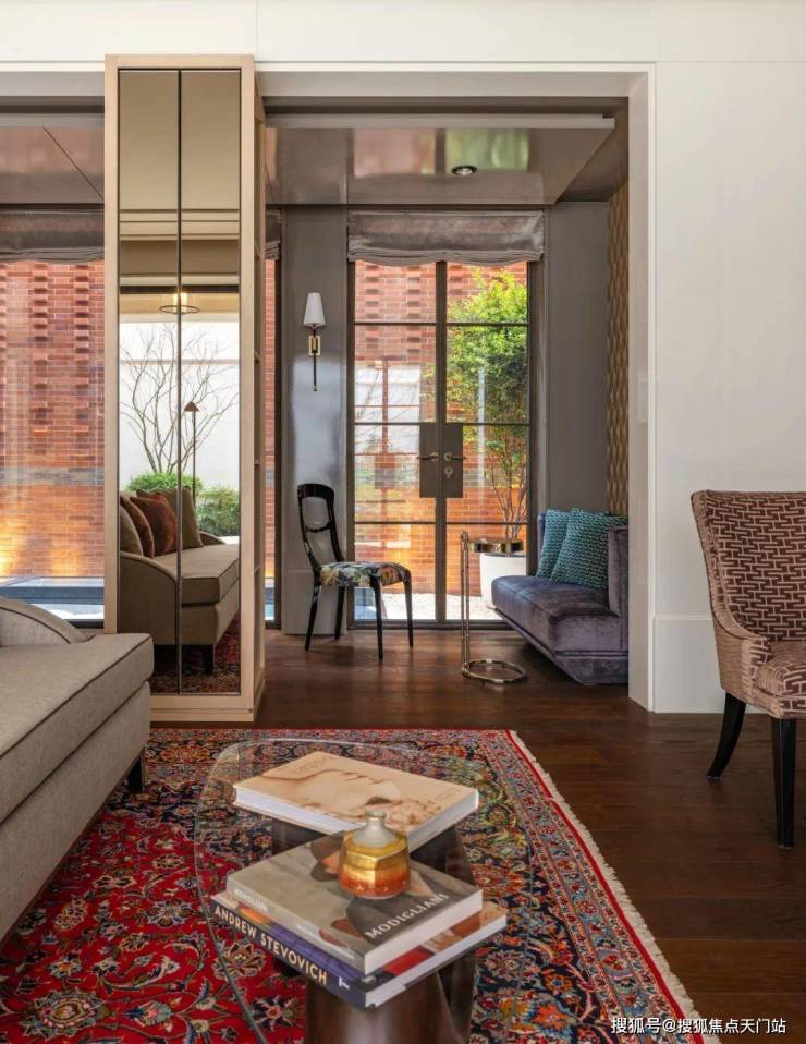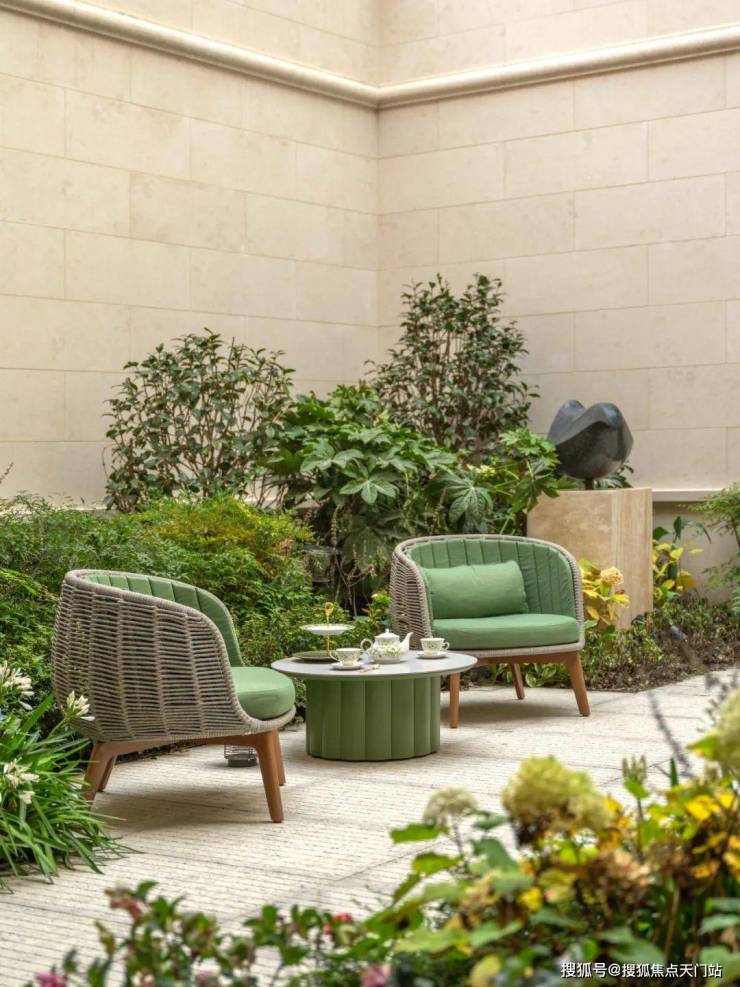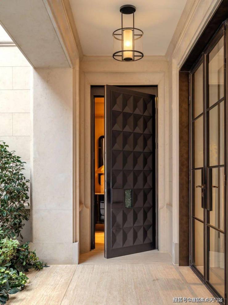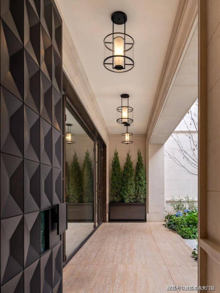 从庭院地面层,可以看到客厅和餐厅的内部空间。客厅在立面上向内凹陷,形成了一条有遮盖的走廊,通向房屋定制的深铜色入户大门。天潼198售楼处预约热线:400-118-3159☎️☎✅✅✅《售楼处已认证》