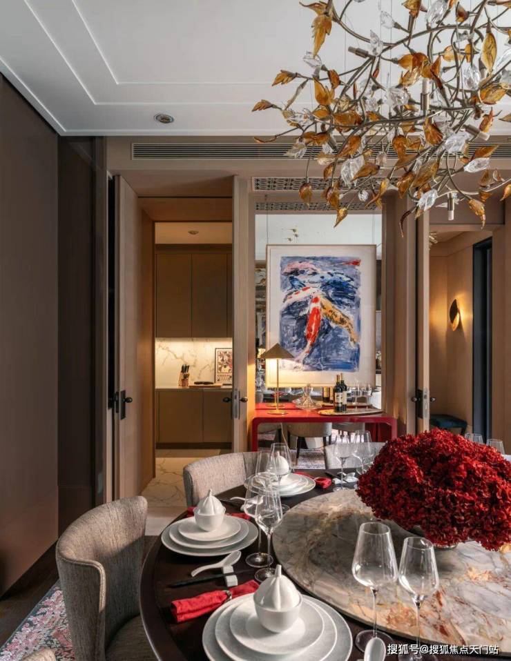 餐厅四角以高光烤漆板为基准,营造出庄重感。空间一侧临近中庭,另一侧毗邻西侧小庭院。天潼198售楼处预约热线:400-118-3159☎️☎✅✅✅《售楼处已认证》