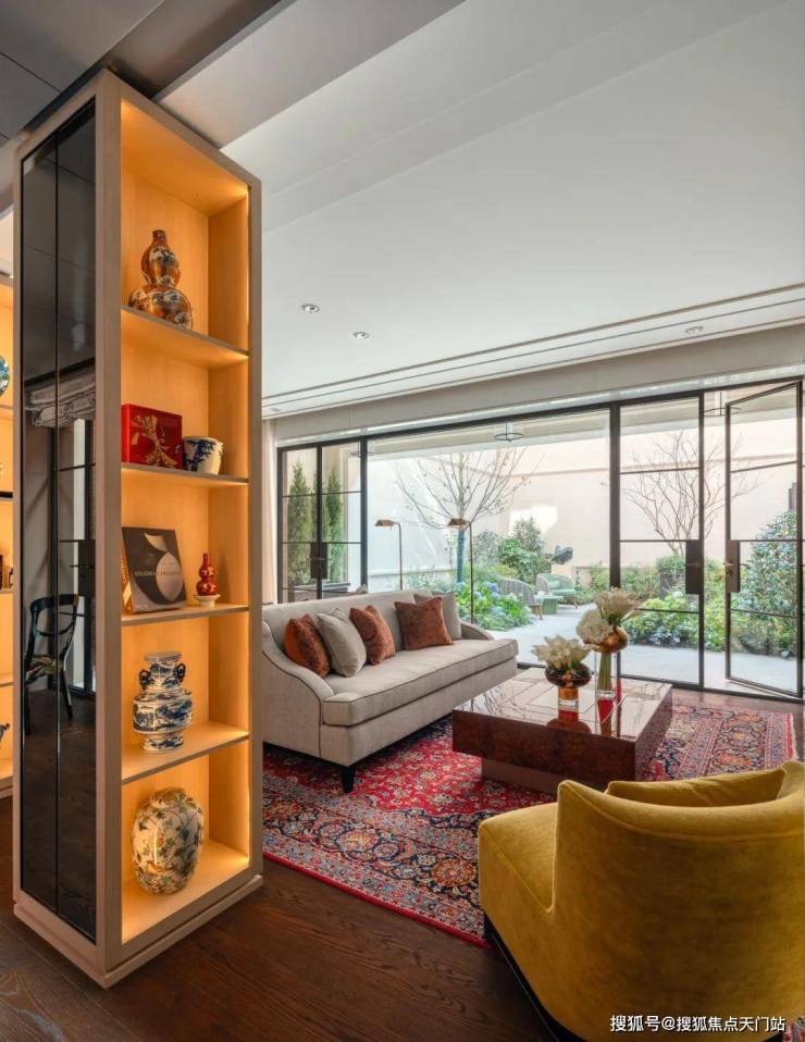 在客厅中,两个展示架巧妙地将空间分隔成主客厅区和休闲室,营造出一个与建筑尺度交相辉映的层次空间。天潼198售楼处预约热线:400-118-3159☎️☎✅✅✅《售楼处已认证》