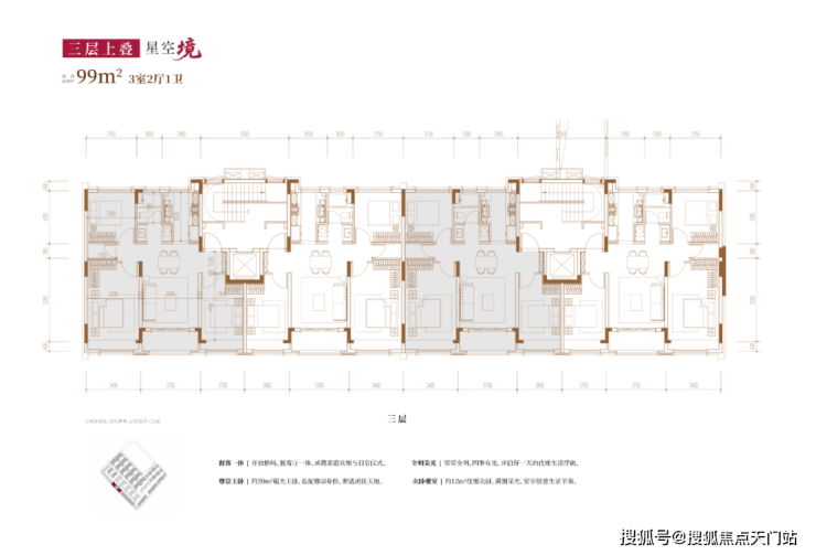 从内部空间体系来看,地上三层,层高分别是3.6米、3.3米和3.3米;每个单元一梯两户,每户均拥有类独立电梯厅;一楼带地下室及庭院,并通过创新退台式设计为二楼和三楼打造私家空中花园,形成户户有花园的墅居生活方式。
