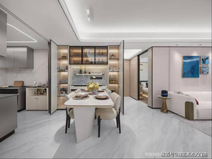 超30㎡餐客方厅采用一体化布局,巧妙地连接南向阳台、U型厨房,形成极佳通风采光通道。轻松容纳6人餐桌,无论是三代同堂的日常用餐,还是周末的家庭聚会,都能从容应对。