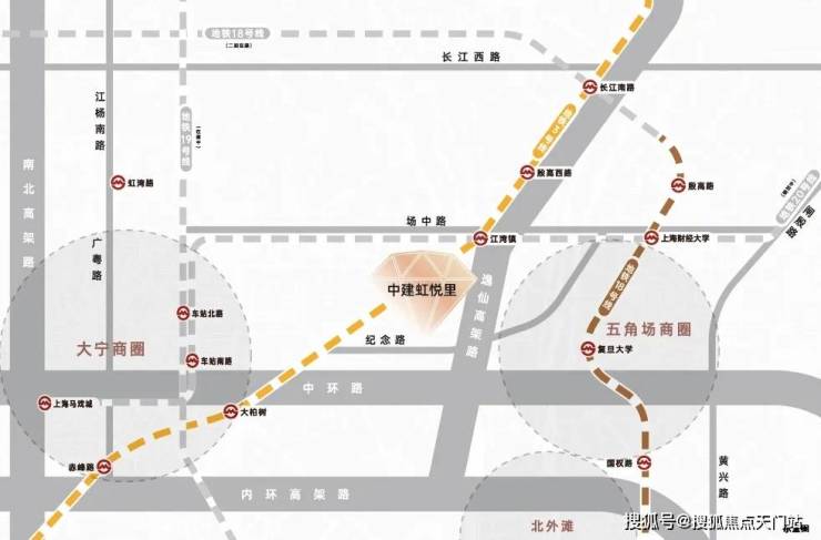 轨交配套:中建·虹悦里直线距离3号线大柏树站约750米,直线距离江湾镇站均约900米,步行可及。3号线也是多年才出一个轨交房。畅联中山公园/延安西路;三重高架:临近中环高架/逸仙高架及大柏树立交,迅捷衔接五角场/大宁等地;干道交通:周边汇聚逸仙路/汶水路/中山北路等城市主干道,便捷抵达全城。