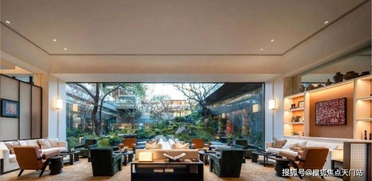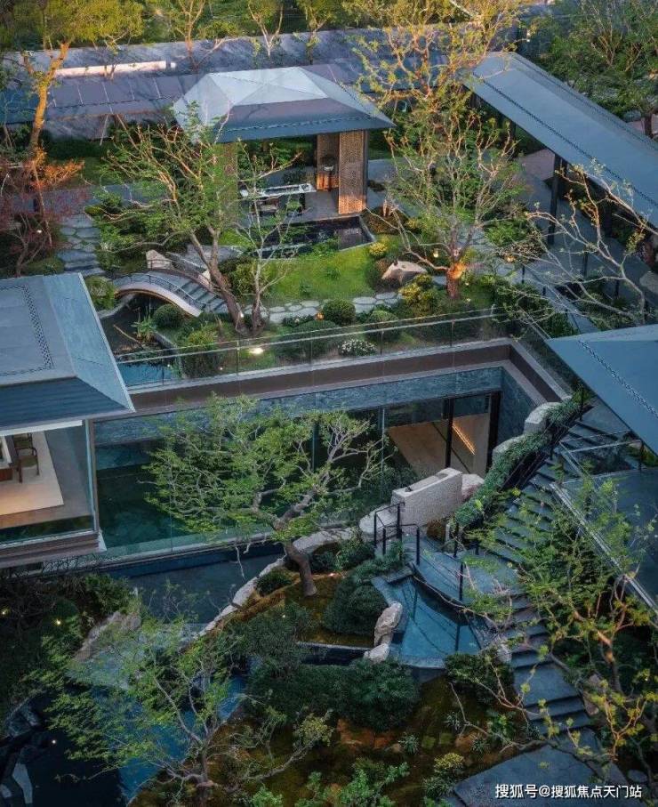 而最令人惊艳的,当属约6米地势差打造的下沉式山水庭院,山、石、水、林有序交织,犹如一幅“豁然开朗山水轴卷,每一步皆是景致,每一处皆有不同。
