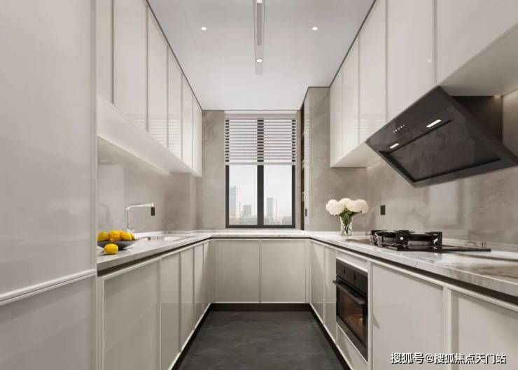 当下比较热门的横厅布局,横厅尺度达6.1米,层高3.15米,同样尺度奢阔。想象一下,家庭小型聚会,一边在大横厅里面和朋友畅聊,一边给友人煮咖啡或烤面包,生活场景丰富多姿。