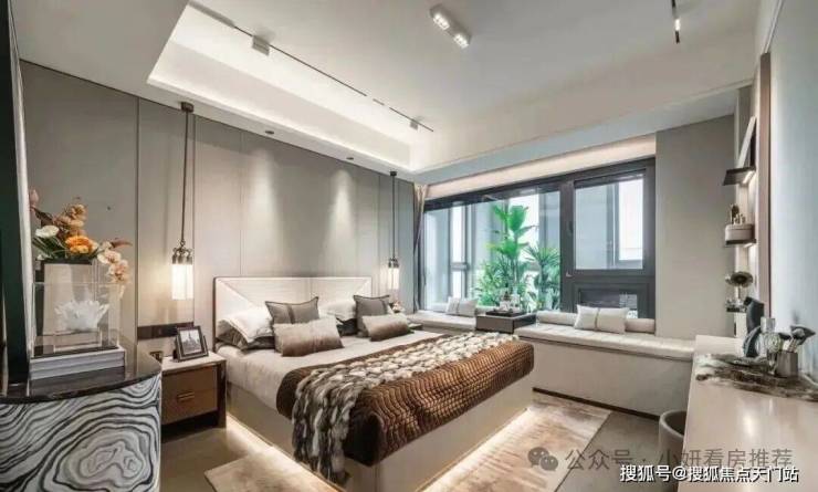整体效果现代精致,十分符合当下年轻人的审美观;星级酒店式入户门,挑高约7米,宽约60米;石材金属线条背景墙加暖色系夜灯搭配,中庭花园水岛层叠、景墙错落,槭树青红间季节流转的温情脉脉展现,精致的水景让居住者仿若初入剧宴,感受剧目的艺术呈现……