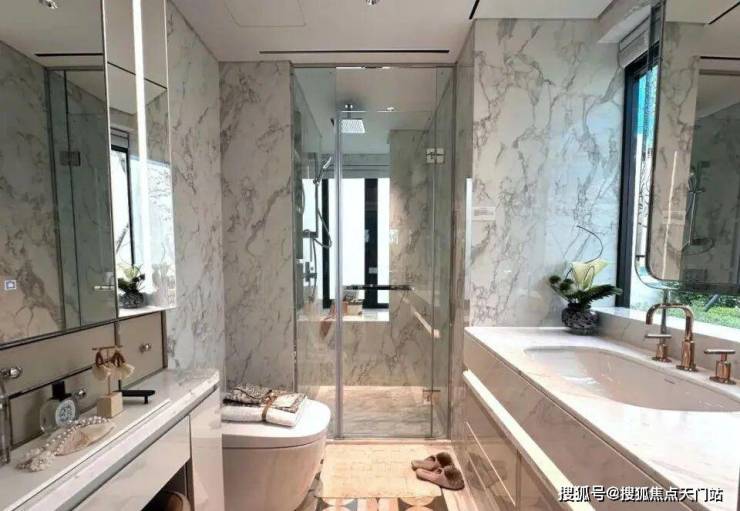 收纳细节上,二期户型中完美继承了一期的收纳系统,玄关收纳,整面内嵌柜体一直延伸到餐边柜;厨房全屋定制的柜体;卫浴的镜面柜和美妆冰箱等等,主卧卫生间的进一步升级:洗手台与化妆台相对,拥有三面镜柜,视觉空间进一步扩展和延伸。