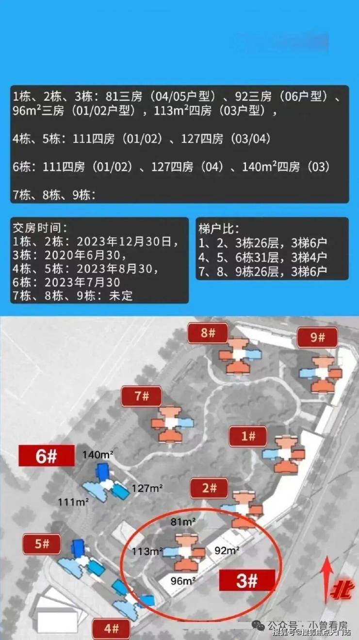 梯户楼栋分布:4、5、6栋为2梯4户,1、2、3、7、8、9栋为2梯6户,26~31层