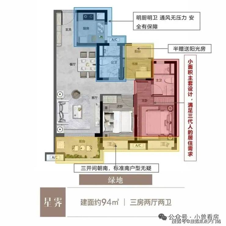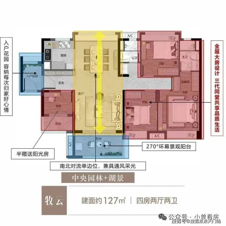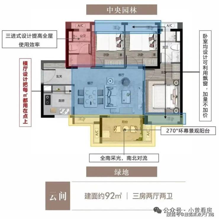 特点:三进式设计提高全屋实用率,270°环幕景观阳台,单边位南北对流采光通风。