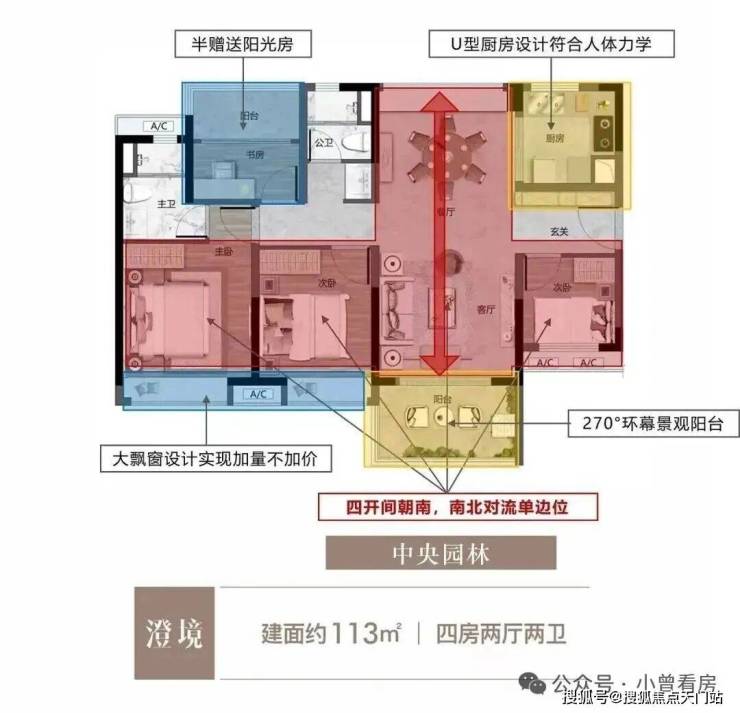 特点:单边位南北对流 采光通风,270°环幕阳台设计,四开间朝南,大飘窗设计。