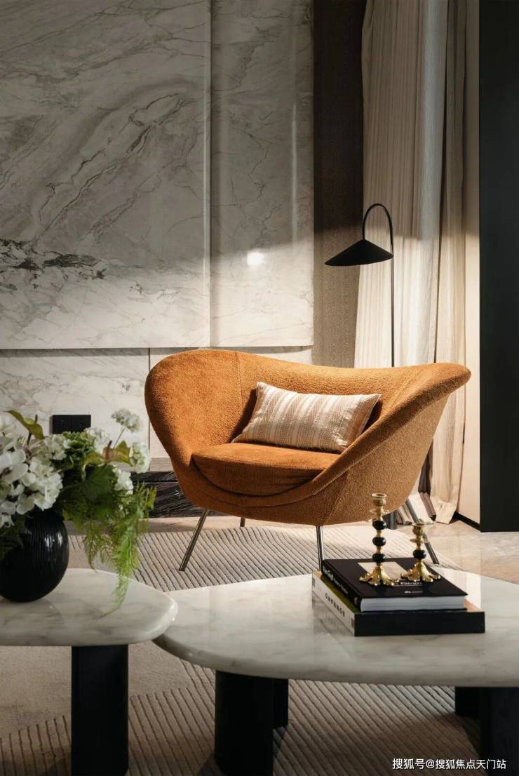 客厅背景墙,奢石的冰凉触感和立体弧线造型很有质感,据说这个弧度的耗材率是平面的1.5倍,成本惊人!